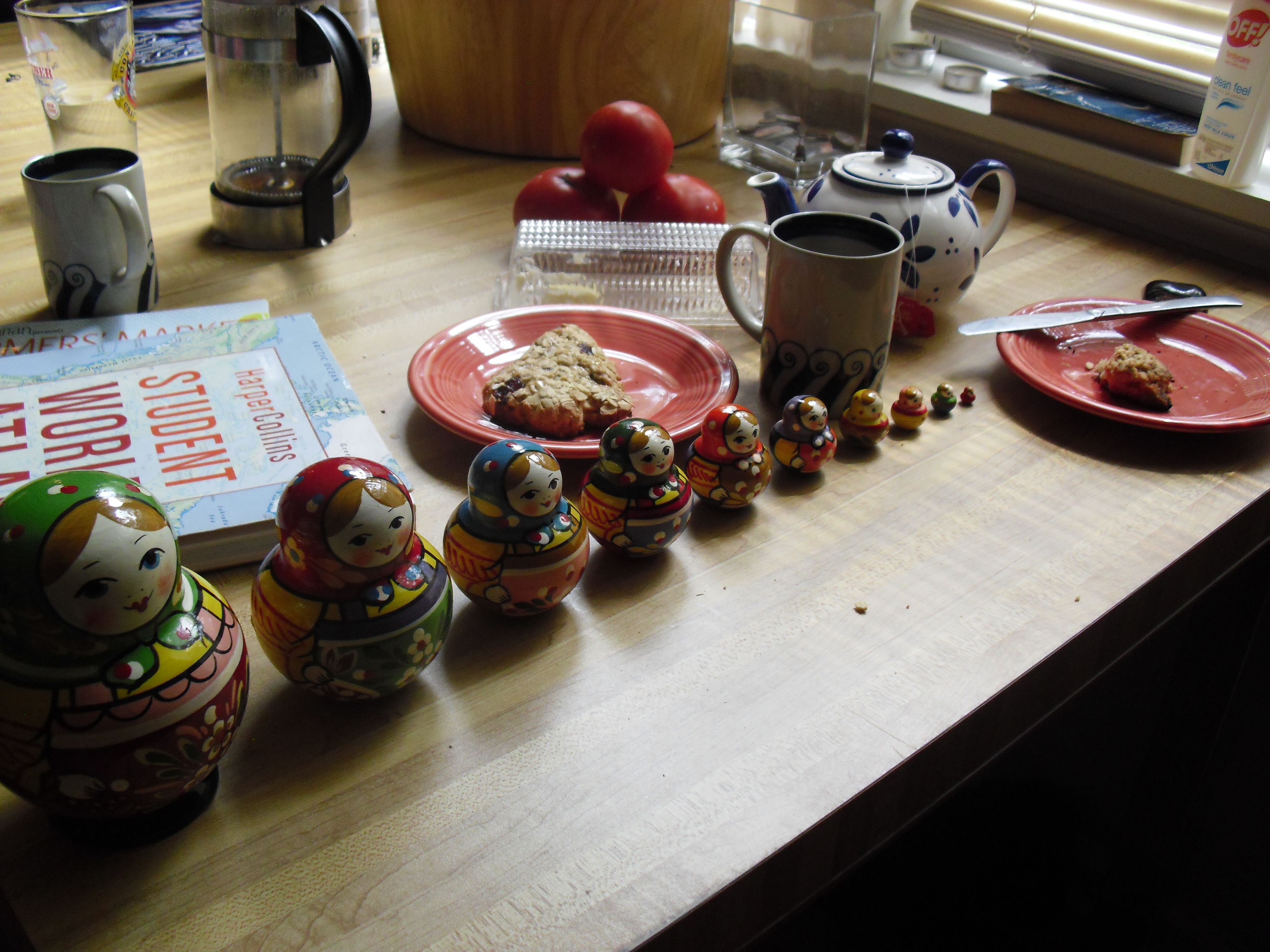 Deciding to split a final scone, sipping coffee, and talking about knitting needles and the possibility of Antarctica, she suddenly said, “Oh! Your present!” And gave me a set of Matryushka. They are colorful, and perfect company for a tea party.