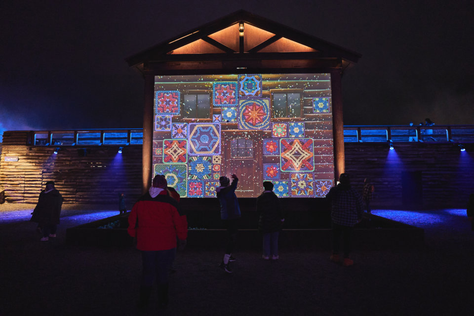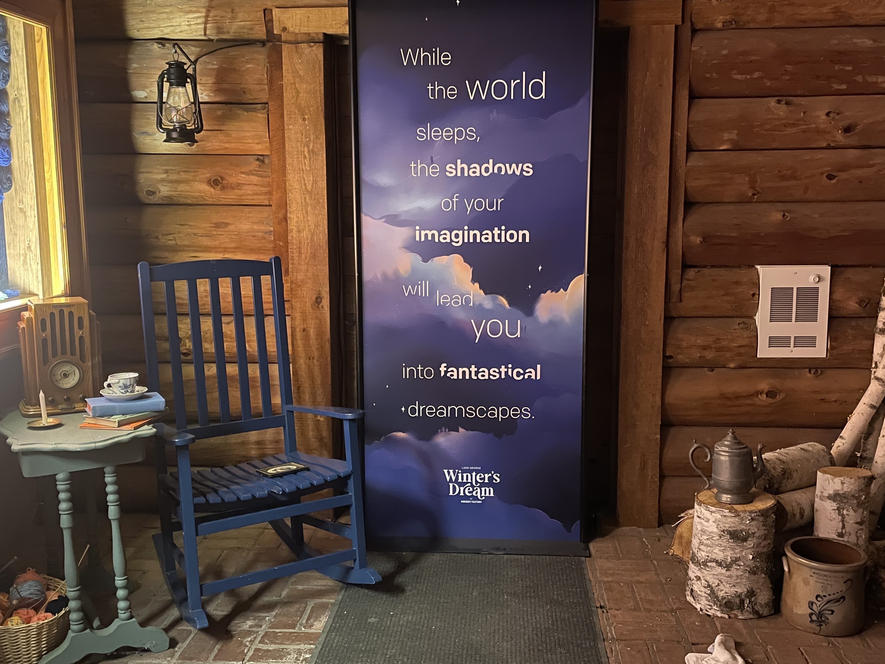 This project showed me that I have a secret wish to be a set designer. I am not, but the next best thing is working closely with an amazing artist who is. This yarn piece (created by scenographer Sarah Lachance) was inspired by a line from the concept development phase: “the dreams of winter are woven together.” It previews a later interactive feature that invites visitors help to “knit up” a Cabin of Dreams, while watching whimsical dreams of winter come to life in the windows. It lives as part of a narrative-driven installation that evokes a scene in a snowy cabin, with a sound design piece that tells a story of winter.